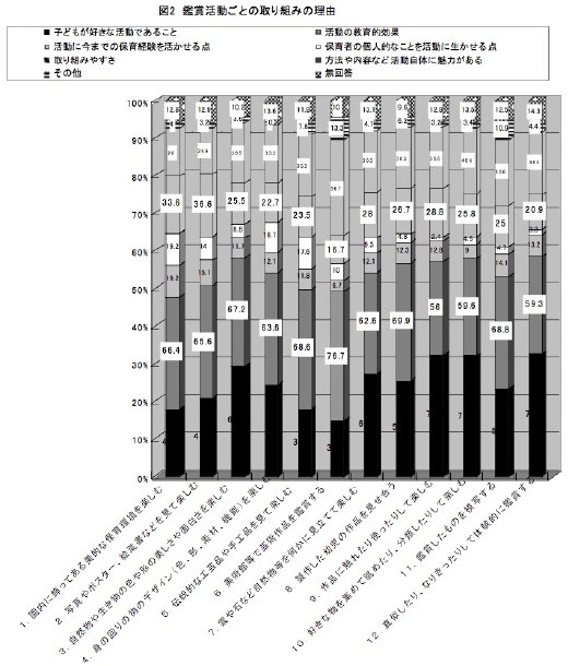 また、調査では7、8、9、10、11、12の活動のような、ただ見るだけではない多様な活動を選択肢として提示していた。これらの活動は図1にあるように取り組みの経験が多いもので90%以上、少ないものでも40%であった。このことから、幼児の鑑賞は見ることを中心としながら、鑑賞対象へのかかわり方が多様であることがわかった。
